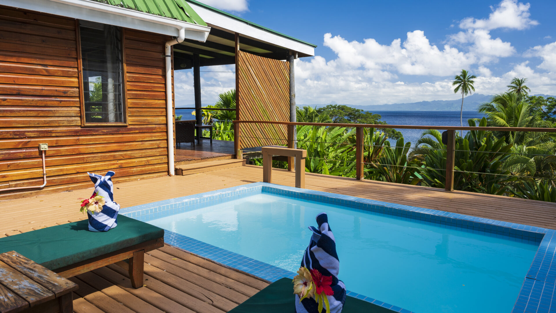Kitchen air-conditioned bedrooms private deck plunge pool with sun loungers.